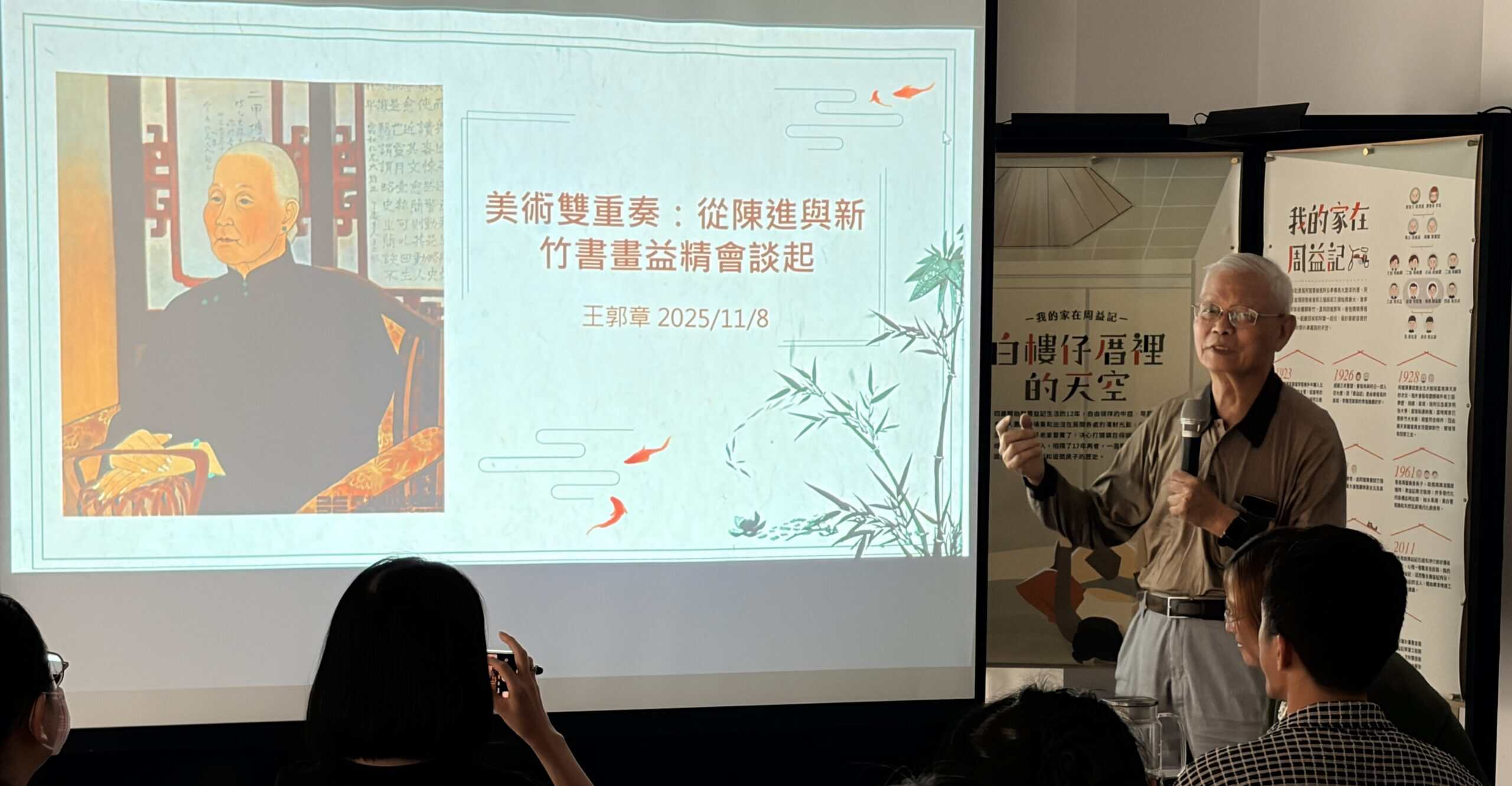 本次講座的起心動念,源自於對家族繪畫脈絡的追尋。為了更深入理解周益記舊藏書畫與臺灣近代書畫之間的關係,團隊申請了國藝會計畫,並展開一系列研究與分享活動。本場演講作為系列活動的開端,特別聚焦於畫家陳進以及「新竹書畫益精會」,藉此回顧1920年代臺灣傳統書畫與日本新美術交會、衝突與轉化的歷史情境。講座由徐淑賢老師以陳進畫作引言開場,再由長年投入新竹文史研究的王郭章老師主講,從臺灣美術展覽會的歷史衝擊,一路談到中西審美觀念的根本差異。