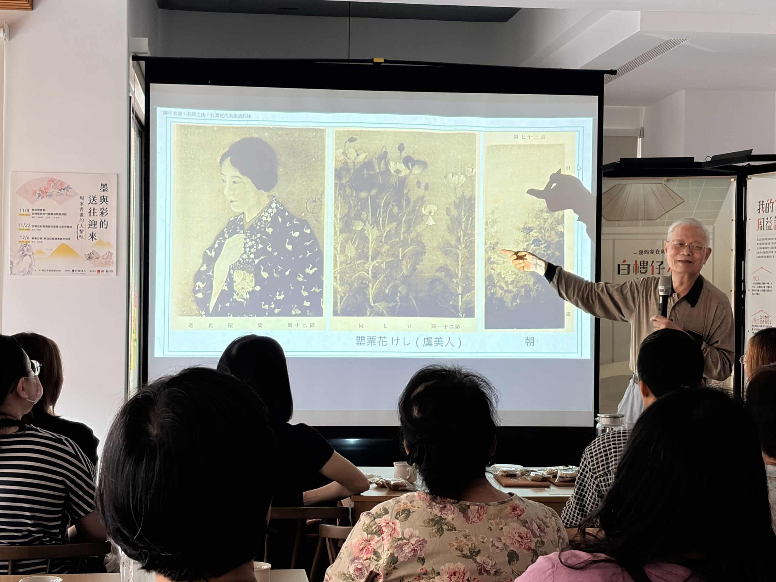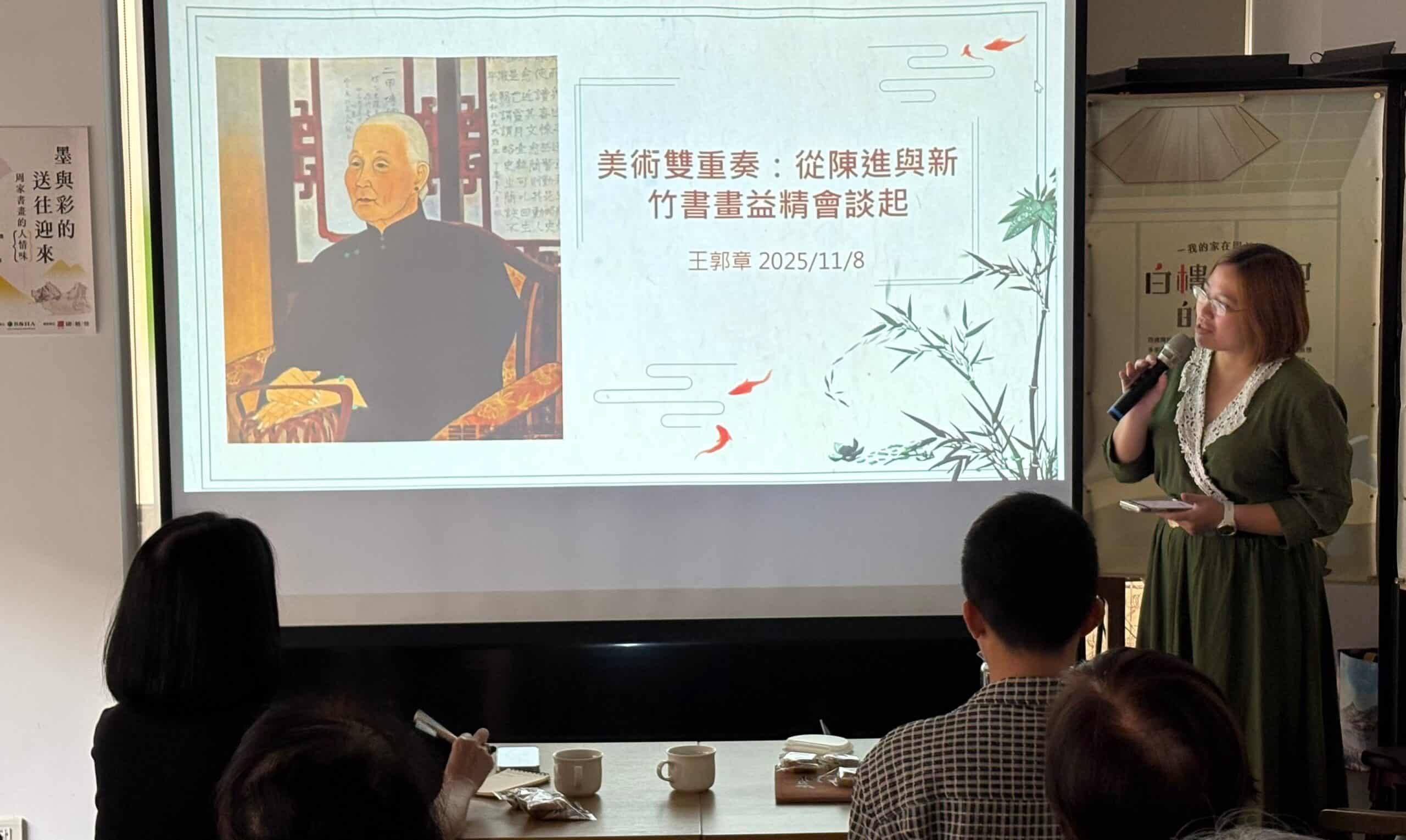 本次講座的起心動念,源自於對家族繪畫脈絡的追尋。為了更深入理解周益記舊藏書畫與臺灣近代書畫之間的關係,團隊申請了國藝會計畫,並展開一系列研究與分享活動。本場演講作為系列活動的開端,特別聚焦於畫家陳進以及「新竹書畫益精會」,藉此回顧1920年代臺灣傳統書畫與日本新美術交會、衝突與轉化的歷史情境。講座由徐淑賢老師以陳進畫作引言開場,再由長年投入新竹文史研究的王郭章老師主講,從臺灣美術展覽會的歷史衝擊,一路談到中西審美觀念的根本差異。