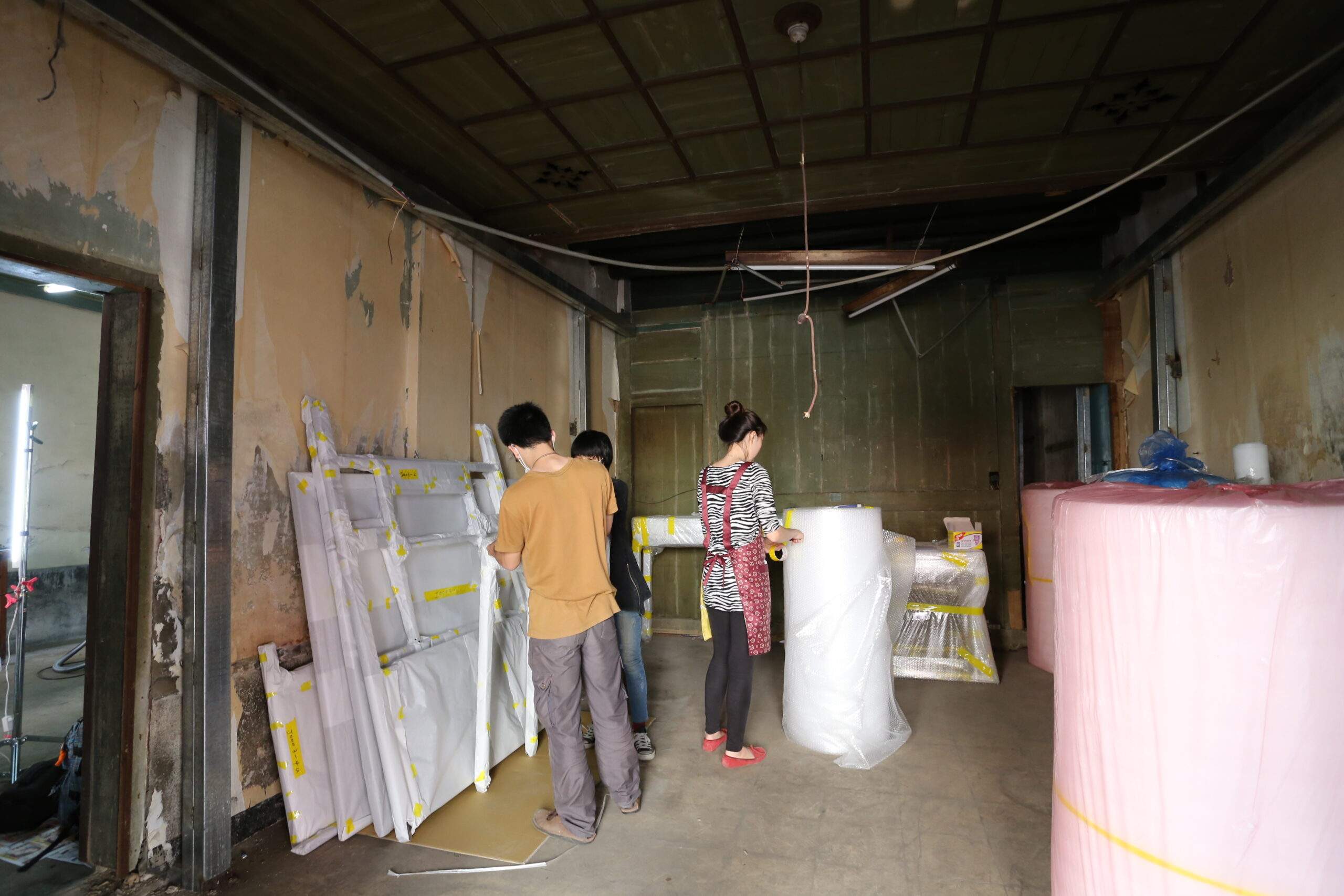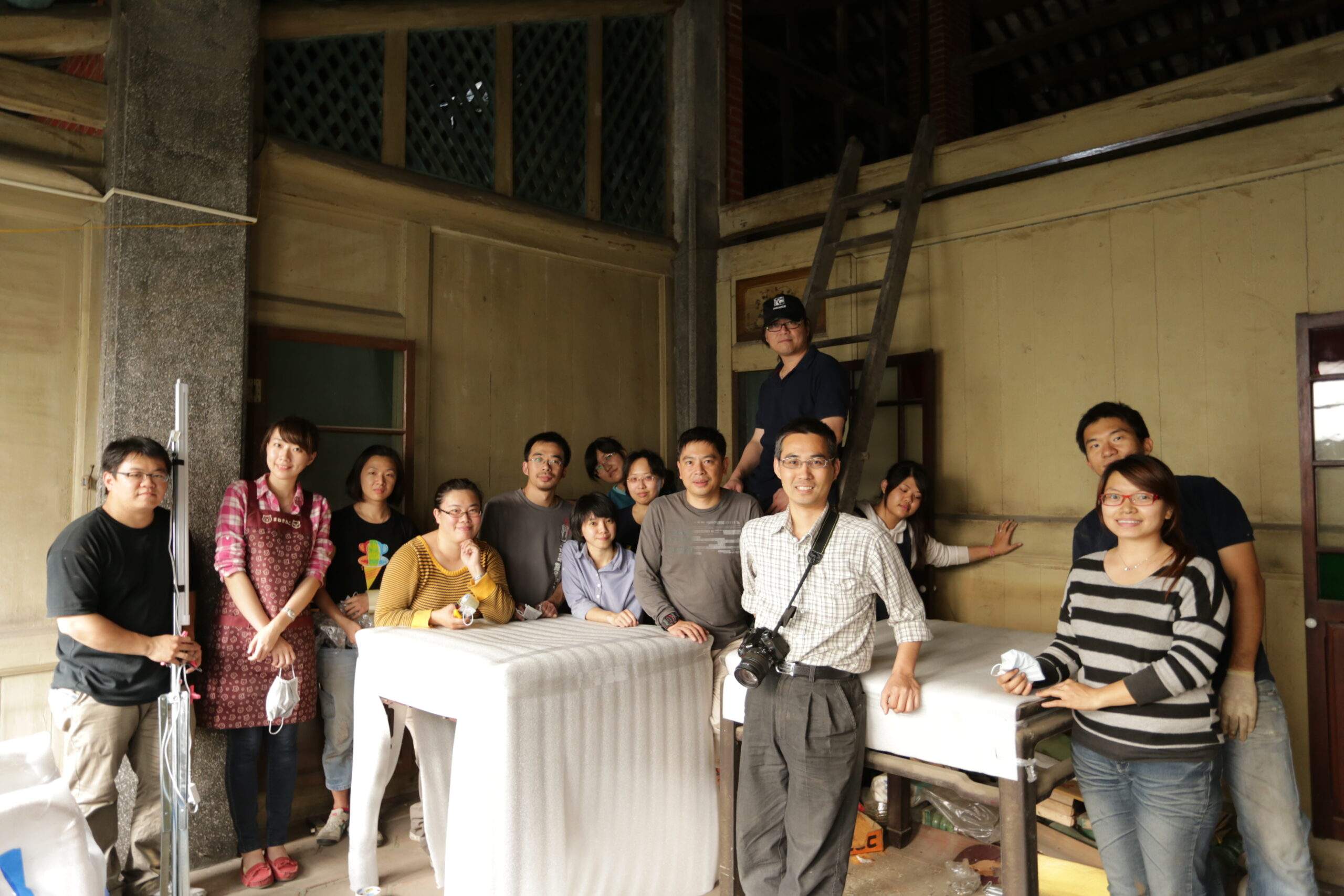 計畫萬全之後,2013年3月9日開始進行家具文物的修復作業。早上8點,仁政老師帶著團隊浩浩蕩蕩在周益記門口集合,一行人包含南藝大在學生與畢業生,以及正修藝術中心的一群年輕工作者們。在我的認知裡,一般來說搬運家具是用棉被包裹或墊著避免碰壞撞傷,但這群專業人士的步驟是先吸塵清潔,然後編號、拍照、記錄,再用泡泡紙或緩衝材仔細包覆、綑紮。兩天內要把屋內的家具打包到嘉義大學的木工工廠,鐵件和陶缸則需再從嘉義運往高雄。一句簡單的描述,卻是十幾個人抓緊時間辛勞的工作,如果不是對古物的熱忱和興趣,誰能在這樣滿佈灰塵和蚊蟲的環境中仔細清點包裝和記錄?感謝這群年輕朋友。