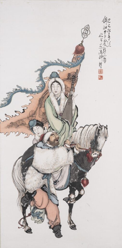 張懷介更進一步指出,李霞之畫作深受民間藝術與戲曲故實影響,常以三人以上的群像營造戲劇張力[2]。本幅〈昭君出塞〉即為顯例:畫作以三人一馬匯聚中心,背景巨大的旌旗呈「S」型,點出其在風中劇烈翻捲的情況,與人馬行進的方向形成強烈的逆向拉扯。