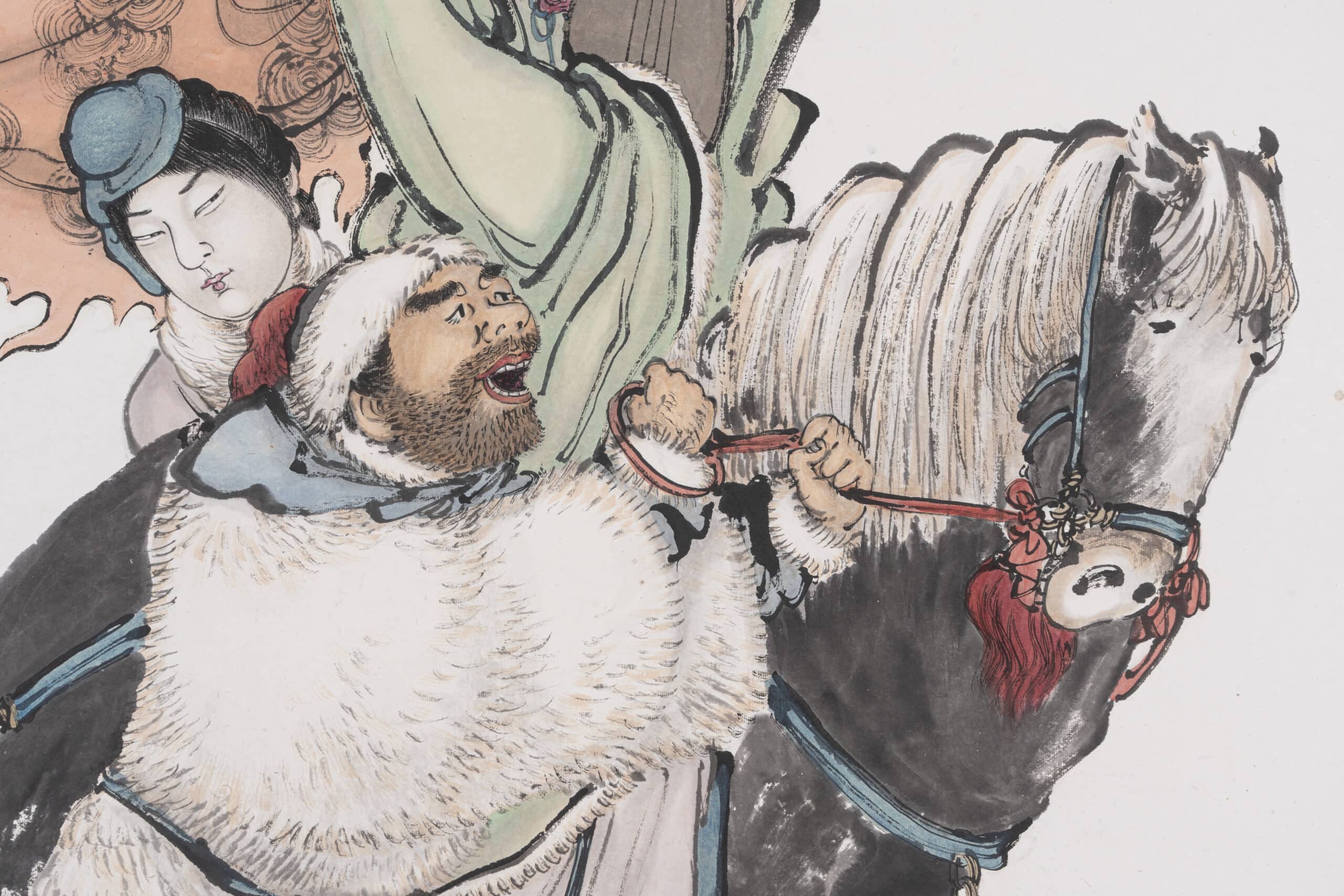 畫中王昭君與侍女的面部以極為細膩的工筆描繪,神態溫婉持重且肌膚質感逼真,宛如傳統觀音造像般靜穆;相對地,前方的胡人則以較為奔放的筆法勾勒,其身著皮裘、單腳勾起且回首吆喝的姿態極具舞台感,宛如京劇中「趟馬」的身段定格。這種細膩面容與粗曠衣飾的並置,不僅突顯了昭君的高雅與邊塞的蒼涼,更展現了李霞將文人筆墨與民間通俗題材結合的功力。