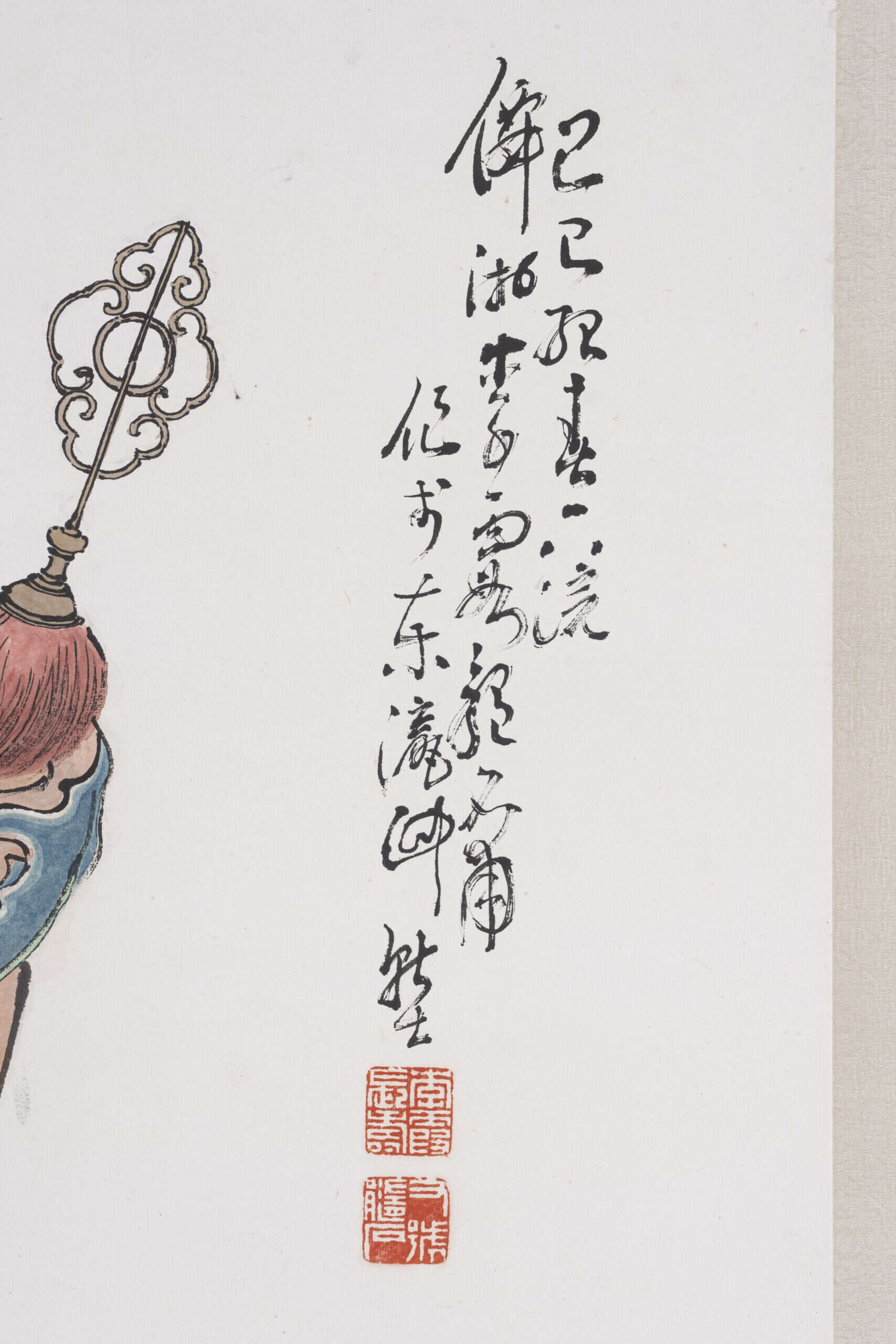 張懷介更進一步指出,李霞之畫作深受民間藝術與戲曲故實影響,常以三人以上的群像營造戲劇張力[2]。本幅〈昭君出塞〉即為顯例:畫作以三人一馬匯聚中心,背景巨大的旌旗呈「S」型,點出其在風中劇烈翻捲的情況,與人馬行進的方向形成強烈的逆向拉扯。