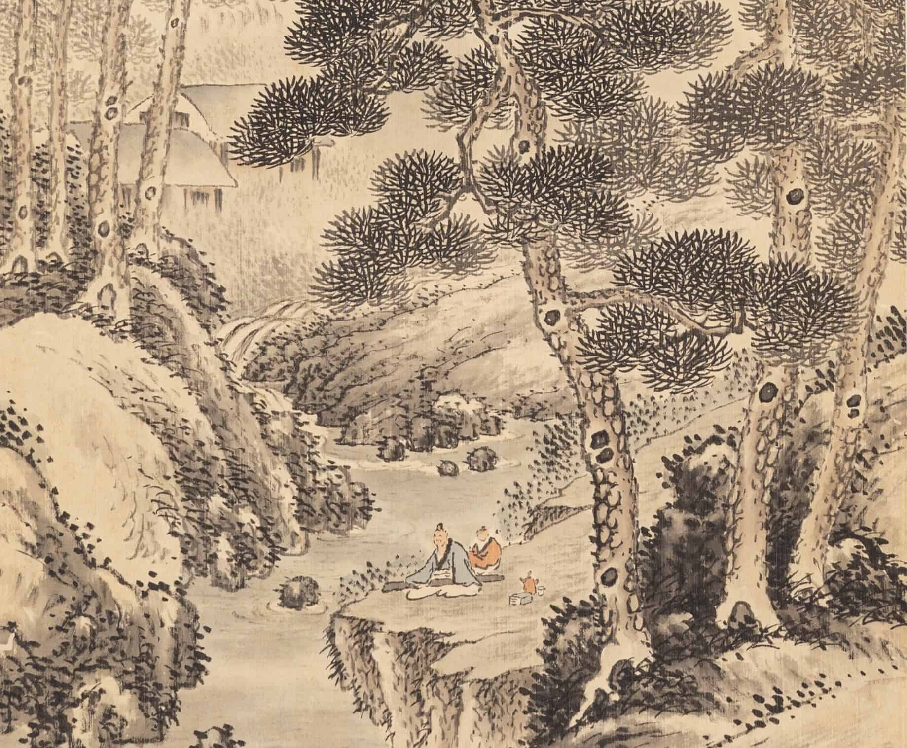 第二幅作品則寫「黃山觀瀑」之壯闊奇景。畫中危峰兀立,飛泉如練直瀉而下,與前景盤石上對坐之高士形成動靜對比。人物凝神觀瀑,不僅在於賞攬造化之奇,更寄託了傳統文人藉由聽泉觀水以滌蕩塵俗、洗煉心性的精神修養。