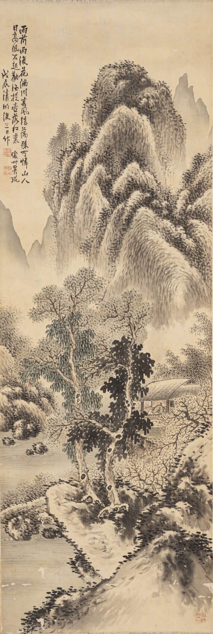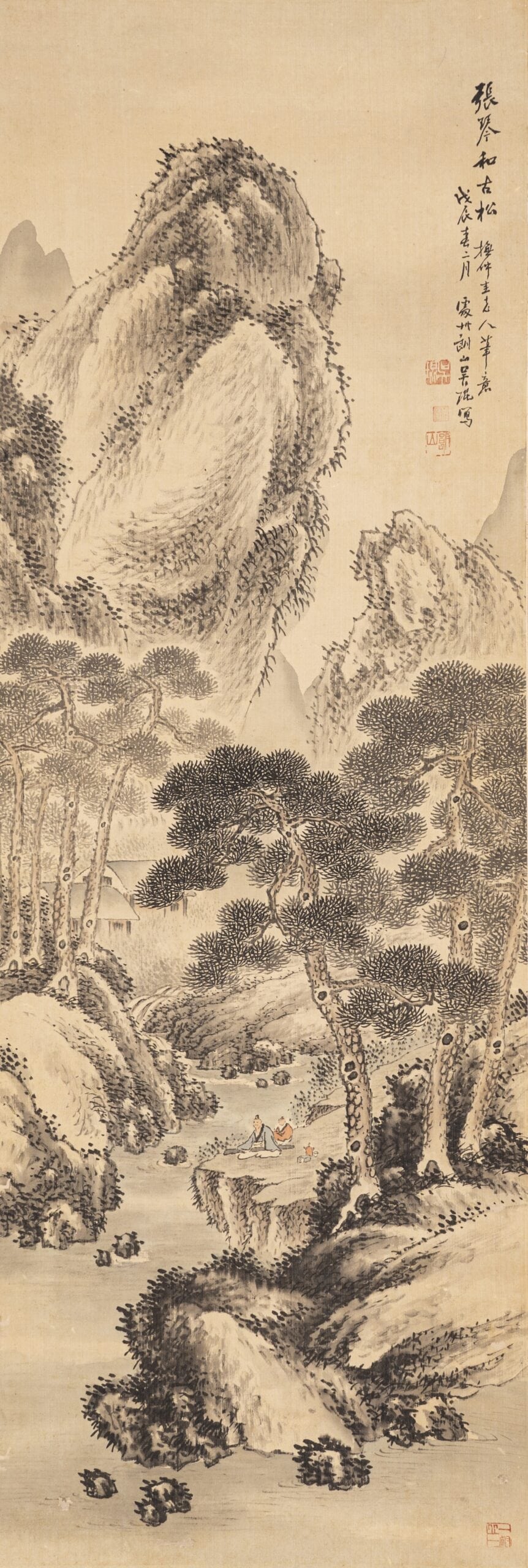 1.「張琴和古松 擬仲圭老人筆意  戊辰春二月」。鈐印「吳琨」、「朗山」。