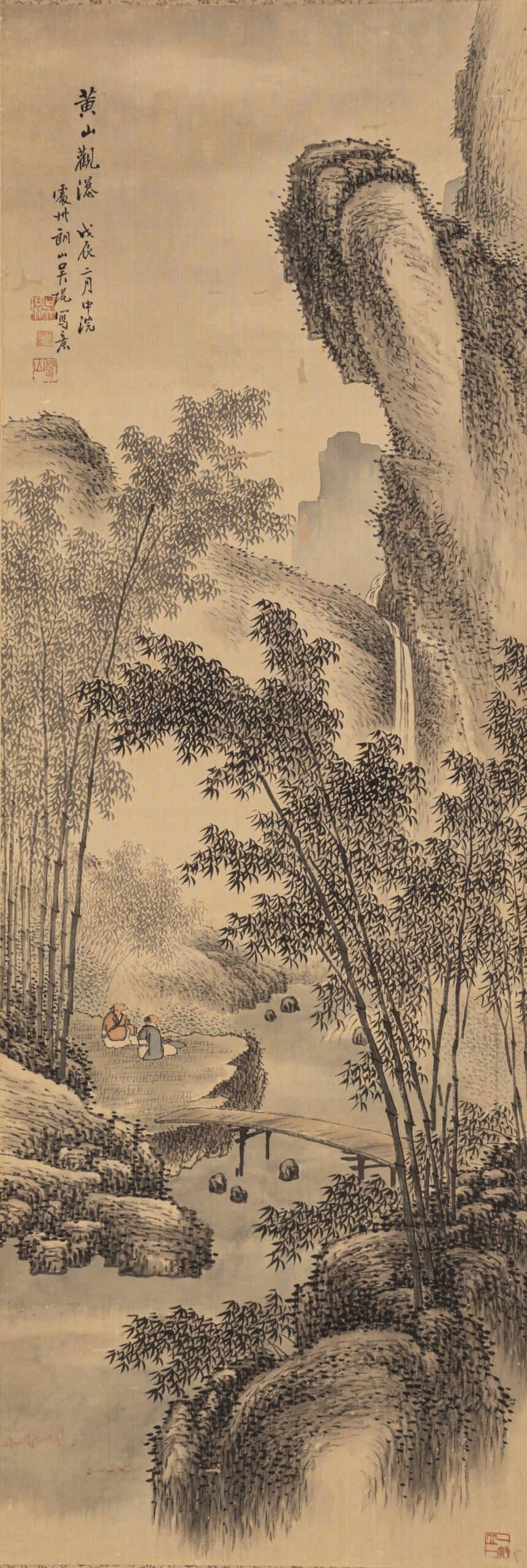 2.「黃山觀瀑 戊辰二月中浣」。鈐印「吳琨」、「朗山」。