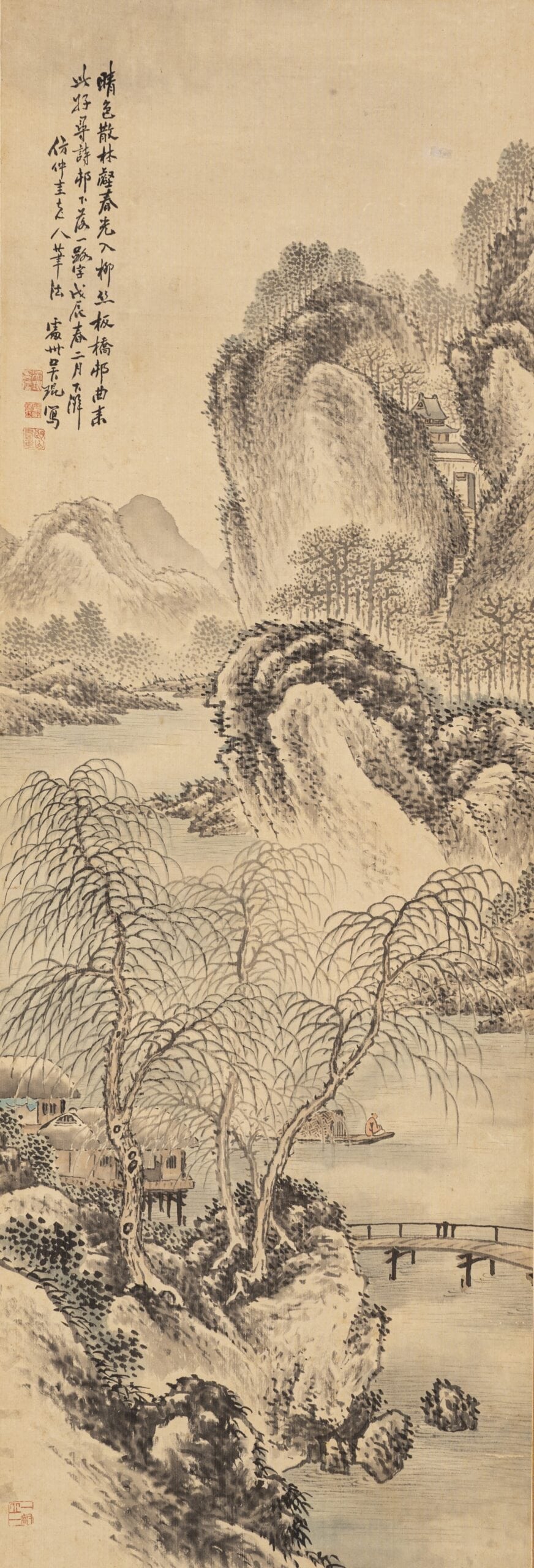 3.「晴色散林壑,春光入柳絲。板橋邨(路)曲,來此好尋詩。邨下落一路字   戊辰春二月下澣」。鈐印「吳琨印信」、「周陳淵圖」、「朗山書畫」、「一丘一壑」。