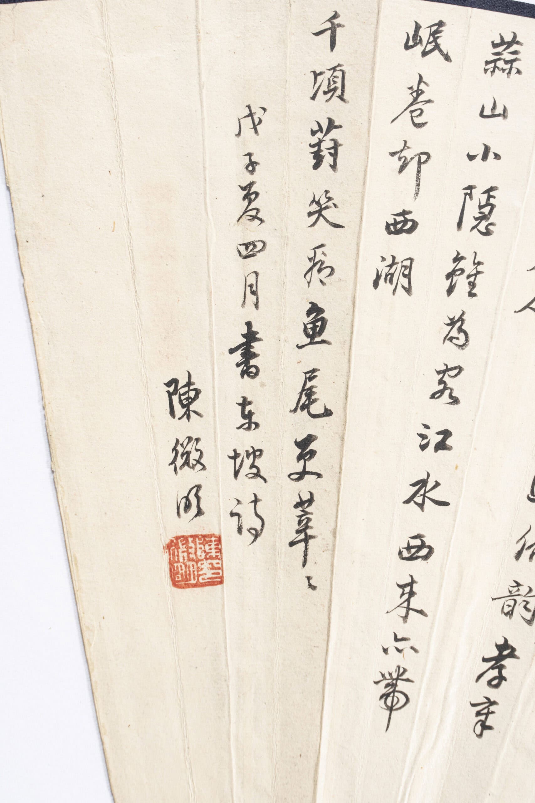 陳微明於1948年題寫蘇軾〈次韻曹輔寄壑源試焙新芽〉、〈次韻袁公濟謝芎椒〉、〈次韻楊次公惠徑山龍井水〉與〈次韻林子中見寄〉四詩於扇面。四詩原為蘇軾與友人唱酬所成,以贈答寄情為重要主旨,其題材涵括新茶、藥材、龍井泉水以及往還寄懷的詩信,展現出文人即使身處漂泊境況,仍以細緻的日常物象承載友情與精神共鳴的傳統。陳微明藉由此詩組的再題寫,使東坡詩中的友誼情感重新落地於他與周敏益的交往經驗之中。